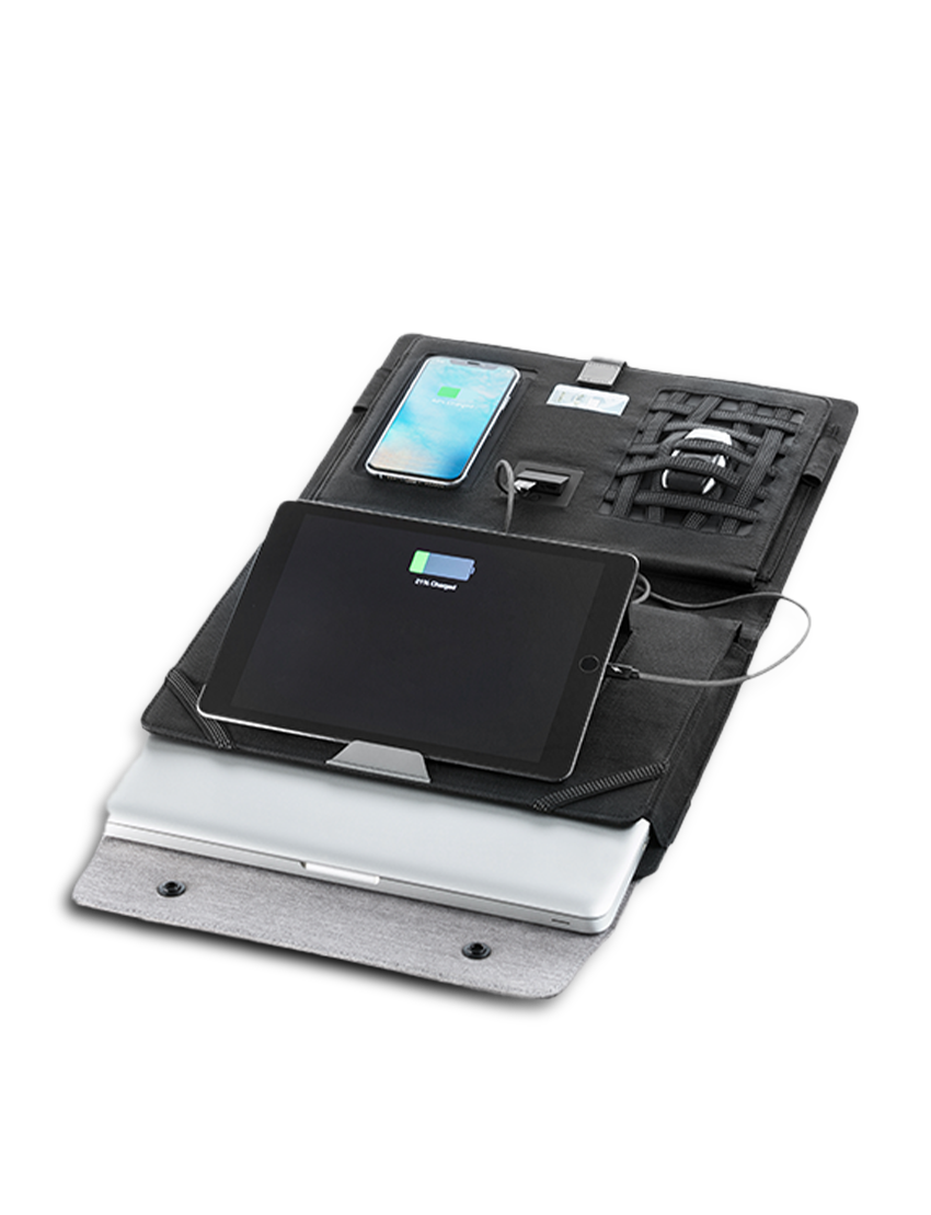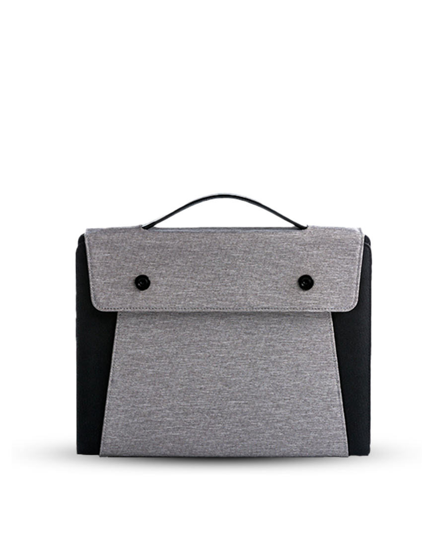 Light Weight RPET Linen Material Computer Bag with 5000mAh wireless charging powerbank Built-in +NFC Technology. Has 2 metal closure and leather handle. The Inside design has card holder, mobile holder with wireless charging, 2 elongated elastic pen loop, crossed elastics as accessories holder, pocket for documents and laptop sleeve with adjustable stand and an adjustable stand on front part for better hold, 4 lights battery indicator and hidden USB port Outside has pocket for documents and wide elastic to use for luggage holder Product Size 27×34.5x4cm Packaging Paper Box with Cream Sleeve